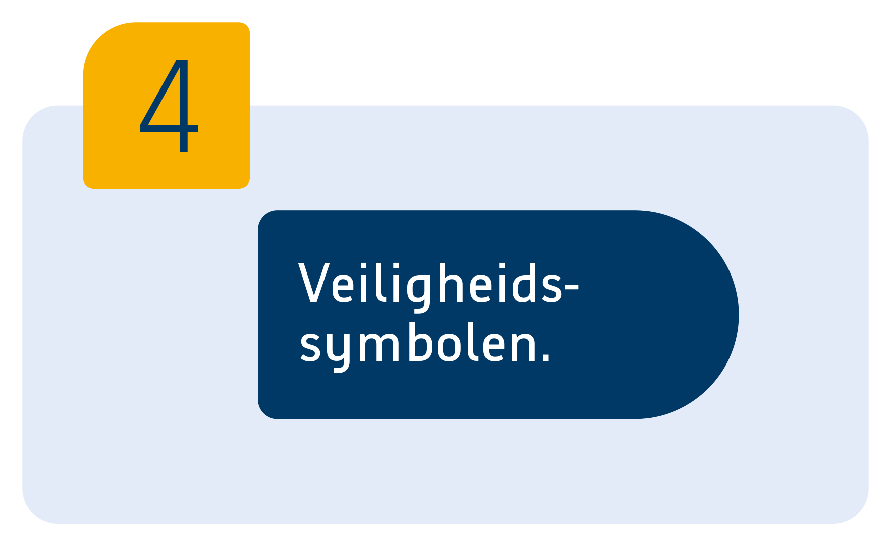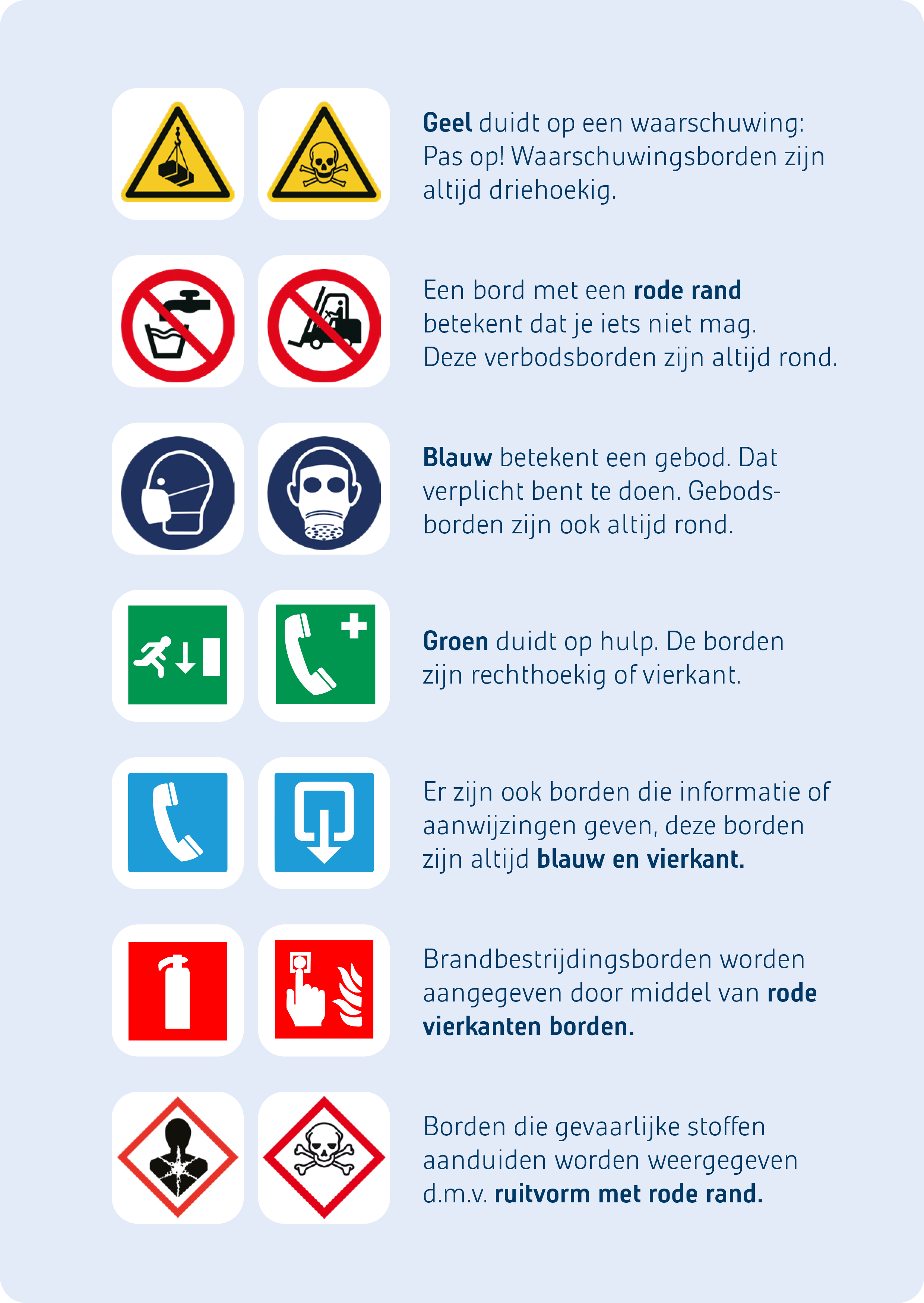 Om helder te kunnen communiceren over risico's, gebruiken we vaste veiligheidssymbolen. Die zijn voor iedereen snel te begrijpen. Voor de bijbehorende borden gebruiken we vaste kleuren en vormen: