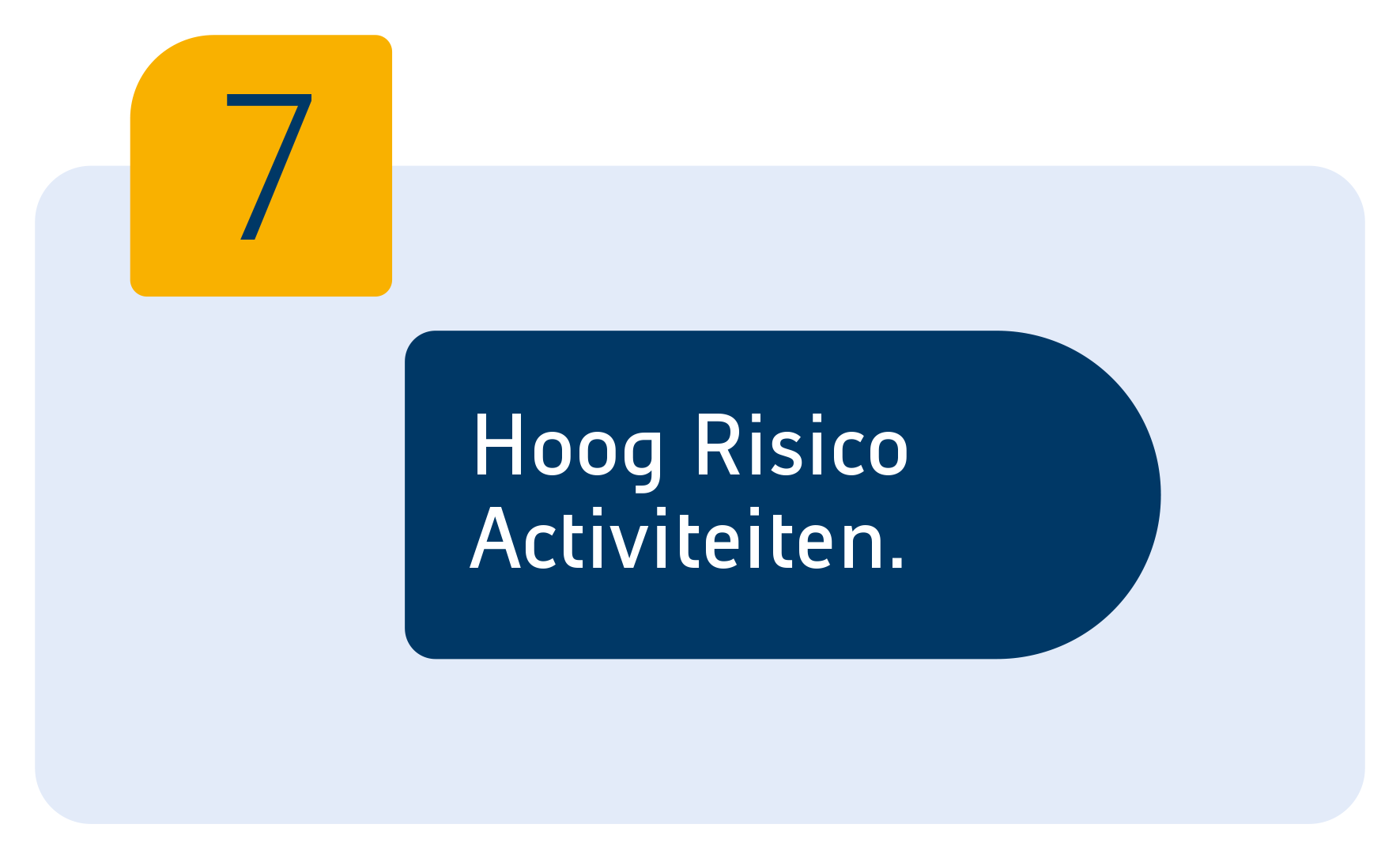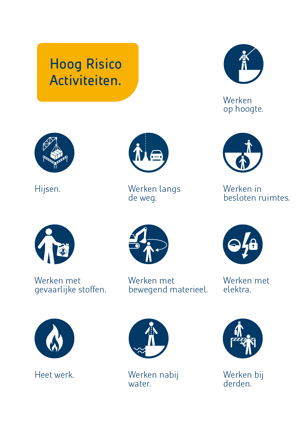 Hoog Risico Activiteiten zijn werkzaamheden die, als ze niet goed worden beheerst, kunnen leiden tot ernstig letsel of zelfs dodelijke ongevallen. Voorbeelden zijn werken op hoogte, werken met gevaarlijke stoffen, werken langs de weg, werken met elektra, werken in besloten ruimtes, hijsen, heet werk (lassen, slijpen, branden), werken nabij water, werken met bewegend materieel en werken bij derden.